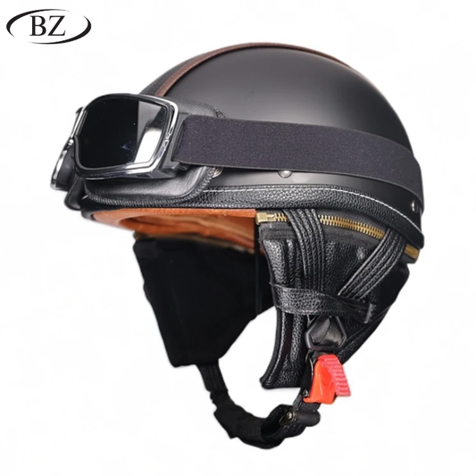 Retro Half Helmet – Classic Leather Finish with Removable Ear Covers – DOT & ECE Approved